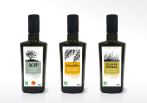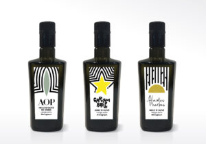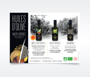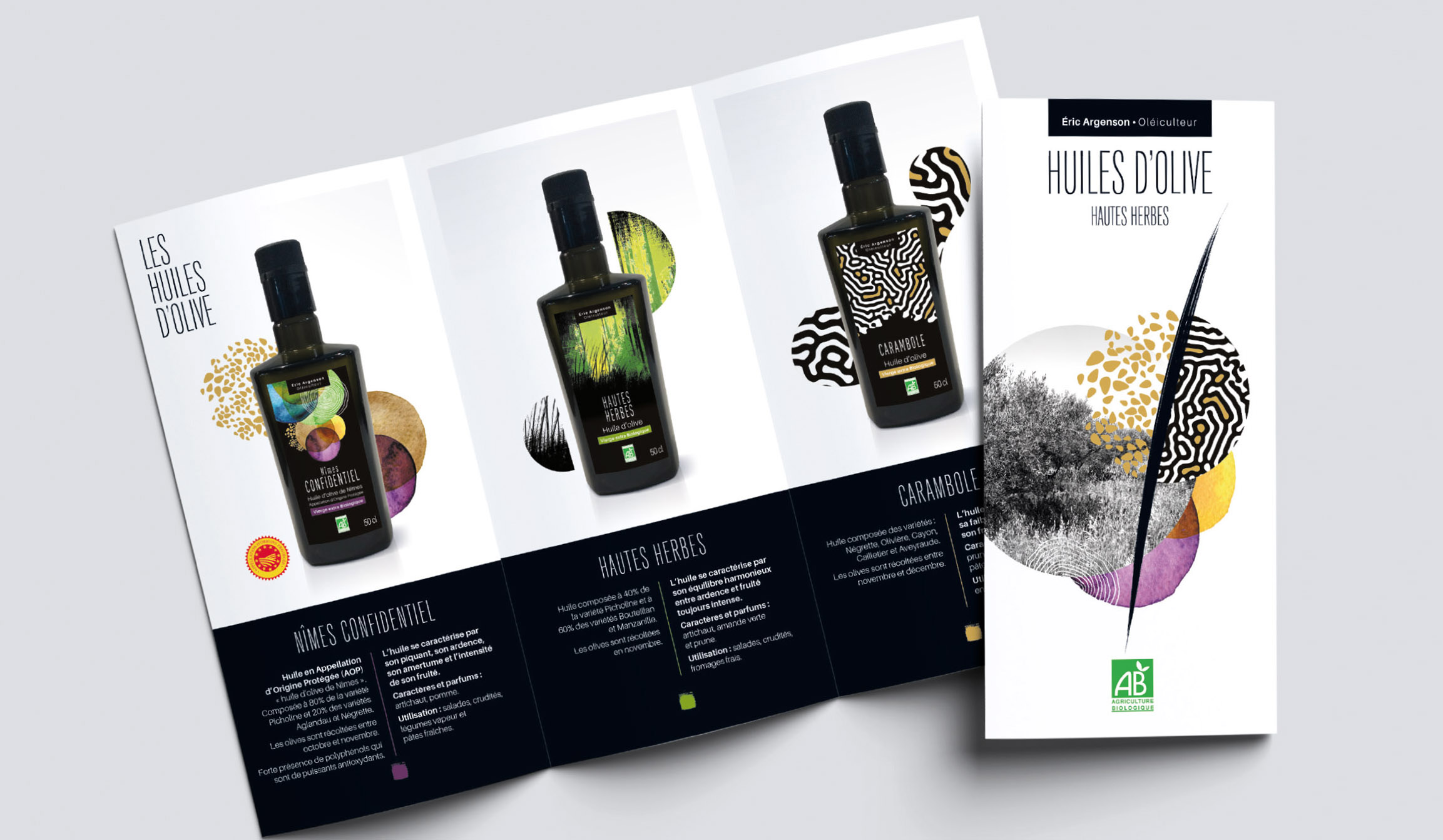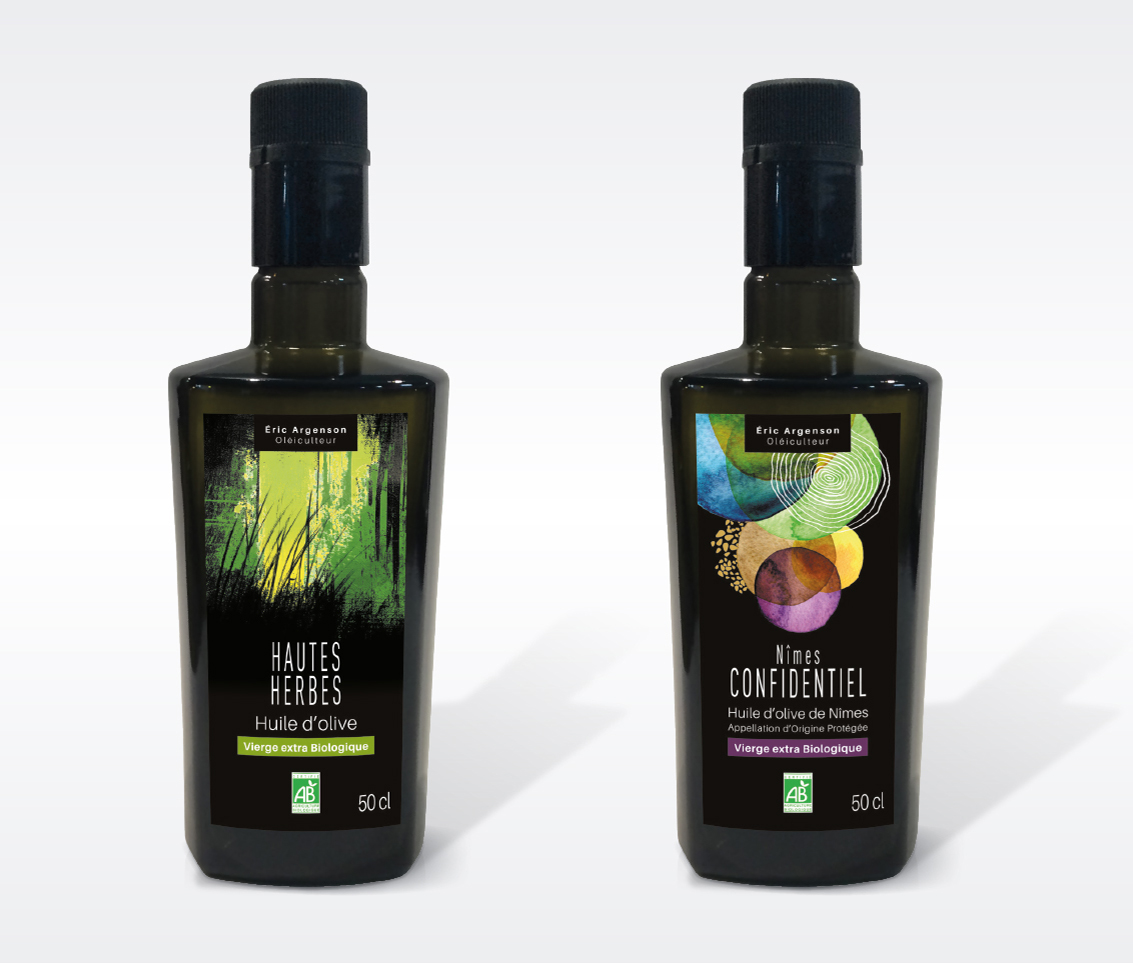 Éric Argenson est oléiculteur à Collias dans le Gard. Nous avons créé pour lui, trois étiquettes pour ses bouteilles avec la demande de rompre avec le style "attendu" des étiquettes d'huiles d'olives. Un univers graphique décliné ensuite sur différents supports.